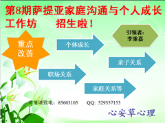 萨提亚作为一套心理治疗方法,最早提出在人际关系及治疗关系中,“人人平等,人皆有价值”的观点,关注家庭环境与家庭成员间的人际互动对个体成长的影响,帮助个体觉察家庭系统存在的动力与力量,通过内在转化促进亲子关系、婚姻关系、职场关系的改善,使个体迈向更一致、更完整,家庭走向更和谐、更健康。最大特点是著重提高个人的自尊、改善沟通及帮助人活得更“人性化”,而非只求消除“症状”,治疗的最终目标是个人达致“身心整合,内外一致”。 一、引领导师:李重嘉 李老师简介:2009年参加香港蔡敏莉老师萨提亚工作坊,2013年跟随中国萨提亚中心郭晓杰女士初、中、高级学习,并荣获劳动部萨提亚咨询师资格证书。 国家二级注册心理咨询师 ,中科院心理研究所婚恋心理与家庭治疗研究生课程;有丰厚的医学知识与心理学理论基础, 参加过心理测量、精神分析、催眠、元认知、家庭系统排列、身心能量疗法、短程焦点、OH卡牌等各种培训,擅长婚恋情感、性问题及神经症咨询等。近年来主要倾向为家庭治疗,并融家排、萨提亚、米纽琴结构式家庭治疗为一体,已渐形成自己的特色。个案累计10920个小时。 二、本次工作坊针对对象: 1、 部分来访者 2、 需要促进沟通、改善家庭关系或职场关系的人员 3、 为教育孩子处于迷茫困惑中的父母们 4、 部分心理咨询师 5、 关注自我成长,追求心身健康的有识之士。 三、时间:暂定12月中旬,每周日下午(2:30—5:30),共六次( 限额20人)。 四、收费标准:980元 (11月底报名可优惠100元) 详情请致电: 85603105 |