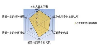 从分布图中,可以看出节假日“留守员工”心理渴望指数最高的是“与家人朋友的团聚”,指数达到93,然后是“工作成果得到上级认可”与“得到一定的精神抚慰”。“留守员工”指数相对较低的需求是“得到一定的物质补偿”。从中可以看出,随着社会生产发展和物质生活的丰富,“留守员工”对物质补偿的需求不再像以前那么强烈,他们更注重精神层面的需求。可见,精神关怀和工作成果的激励对于开展员工心理健康工作具有重要的意义。